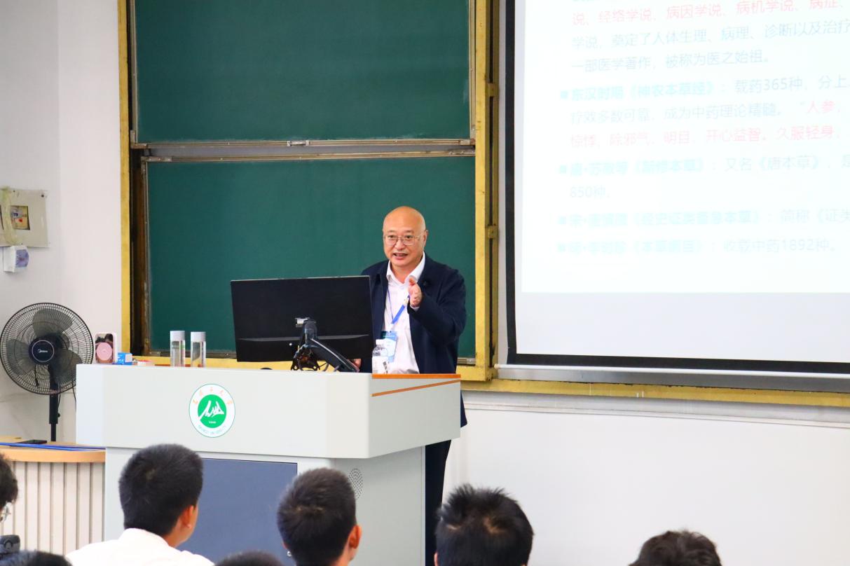 屠鹏飞教授以“中药产业-从传统到现代,从生态到健康”为题,阐述了中医药的悠久历史与现代价值,就中药现代化、质量控制与大健康产业前景等关键问题进行了深度讲解;他通过其团队对濒危药材肉苁蓉从基础研究、新药研发到规模化种植、助力荒漠化防治和区域经济发展的全链条创新案例,生动诠释了药学研究的广阔天地与社会责任,使新生对药学服务“健康中国”与国家战略的深刻内涵有了直观理解。