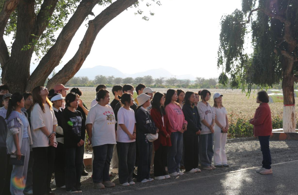 在一四三团军垦二代博物馆,面对上万件锈迹斑斑的实物,薛教授把“展馆”升级为“考场”。她提前设计“红色寻宝卡”,要求每组找到三件展品并回答“它见证了怎样的青春选择”。随后,她邀请陈宇奇博士讲解, 生动还原了军垦二代接续奋斗的历程。这些承载着岁月的物件,让积极分子们清晰地看到“扎根边疆、保卫边疆”的精神如何代代相传,更懂得这份精神财富正是自己未来成长的力量源泉。随后,薛教授把大家带到143团农一连棉田,让同学们伸手触摸滴灌带,实地了解现代农业发展成就,感受“兵团精神”在新时代的脉搏。