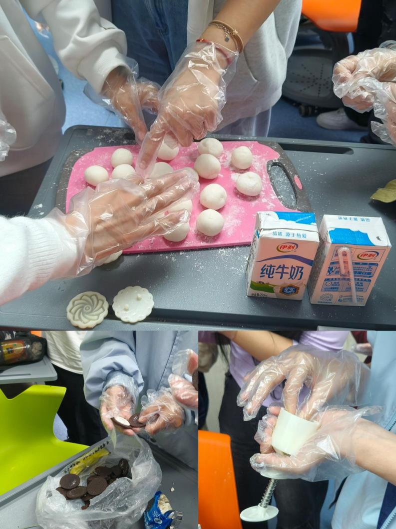 最受期待的月饼制作环节压轴登场。同学们分工协作,揉面团、调馅料、压模具,相互指导技巧,分享制作心得。在欢声笑语中,一个个造型精致、口感清甜的冰皮月饼被制作成,大家捧着亲手制作的月饼,品尝着劳动成果,感受着集体活动的温暖。