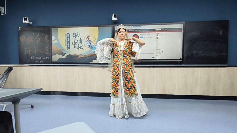 班会现场气氛在文艺表演中推向高潮。阿依先•吾司曼同学身着华丽的维吾尔族服饰,带来了极具民族特色的舞蹈表演。她的动作舒展灵动,笑容明媚动人,充分展现了维吾尔族文化的独特魅力,赢得在场同学的阵阵掌声。