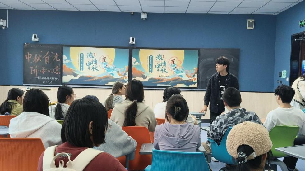 活动伊始,班长为同学们讲解中秋节的起源与发展,细致梳理了赏月、祭月、吃月饼等传统习俗,让大家在回顾中加深对中秋文化内涵的理解。随后的“家乡风采分享”环节中,来自不同省份的同学结合自身经历介绍家乡的特色美食与自然风光,从江南的软糯糕点到西北的壮丽山河,从西南的特色风味到东北的人文景观,同学们在交流中拓展视野,也拉近了彼此的距离,来自天南海北的同学此刻成为一家人。