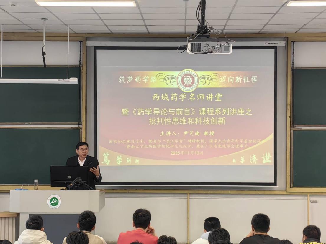 20251113日下午,石河子大学药学院《药学导论与前言》课程特邀国际知名免疫学家、教育部“CJ学者”特聘教授、暨南大学生物医学转化研究院院长尹芝南教授,为2025级本科及博士新生主讲以批判性思维与科技创新为主题的导论课程。尹教授围绕批判性思维在科研创新中的核心作用展开深入讲解,引导新生树立科学思维,拥抱创新精神。