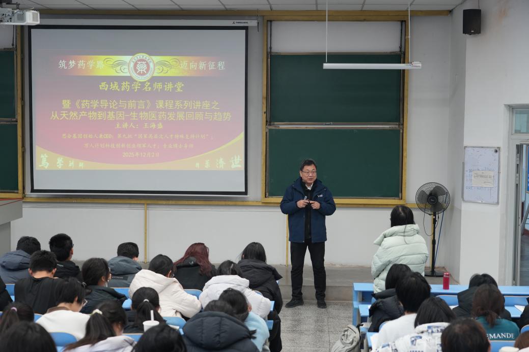 2025年12月2日下午,石河子大学药学院“西域药学名师大讲堂”暨《药学导论与前言》课程特邀思合基因创始人兼CEO王海盛博士,以“从天然产物到基因:生物医药发展回顾与展望”为题,为2025级本科生、博士生全体授课。