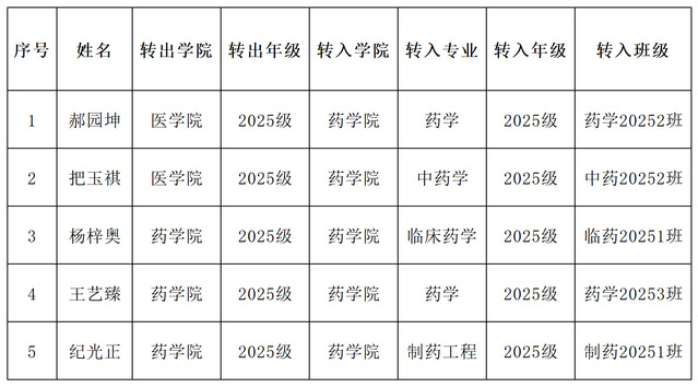 根据《石河子大学普通本专科学生管理规定》(石大校发〔2025〕28号)《关于做好石河子大学2025-2026学年第二学期转专业工作的通知》有关要求,结合《药学院2025-2026学年第二学期本科生转专业工作实施方案》,经个人申请、资格与材料审核、面试及综合评审,拟同意郝园坤等5名学生转入药学院相关专业,现予以公示。